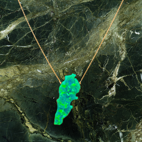The pendant is made entirely of iridescent opal, shimmering with hues of cream, gold, and soft fire — echoing the light of the Mediterranean, the glow of Beirut, and the resilience of a people who rise, rebuild, and remember.